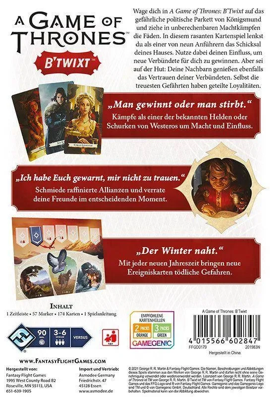Wagt euch in A Game of Thrones: B’Twixt auf das gefährliche Parkett von Königsmund und zieht in unberechenbaren Machtkämpfen die Fäden. In diesem rasanten Kartenspiel lenkt ihr als einer von neun Anführern das Schicksal eures Hauses. Nutzt dabei euren Einfluss, um neue Verbündete für euch zu gewinnen. Aber seid auf der Hut: Eure Nachbarn genießen ebenfalls das Vertrauen eurer Verbündeten. Selbst die treusten Gefährten haben geteilte Loyalitäten.