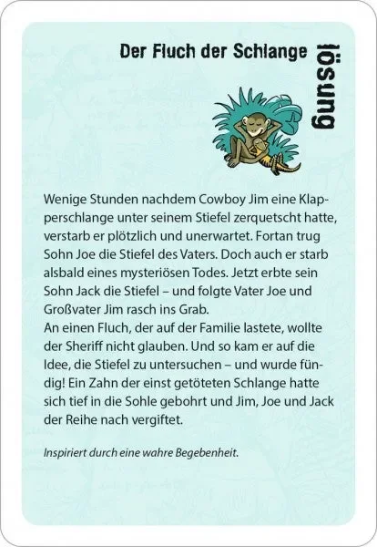 Wenn die Sonne erbarmungslos vom Himmel brennt, der Trinkwasservorrat langsam schwindet und man von einer Meute hungriger Hyänen umkreist wird – dann ist Zeit für eine Runde Action. Die adventure stories versammeln 50 gefährlich knifflige Rätsel voller Abenteuer, die auch dem scharfsinnigsten Ratefuchs die Schweißperlen auf die Stirn treiben. Egal, ob kopflose Kakerlaken, hilfreiche Haie oder gefräßige Geier: In diesen nervenaufreibenden Rätselgeschichten passieren haarsträubende Dinge, deren Geheimnisse man nur durch Fragen, Raten und Tüfteln lüften kann. Für alle, die das echte Abenteuer suchen, ist diese black stories Junior Edition genau das Richtige.