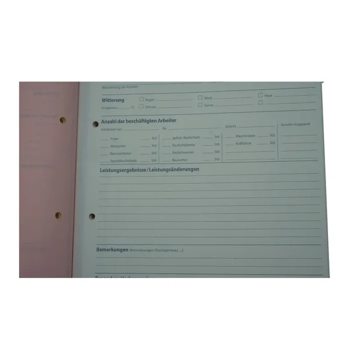 Dieses Bautagebuch entspricht den Anforderungen der Baubehörden und dient der Dokumentation von Arbeitsleistungen, Arbeiteranzahl, Arbeitsstunden u.s.w.