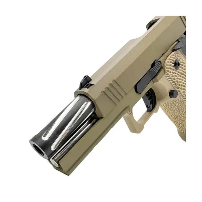 Entdecken Sie die „Command Elite“ 4.3 Hi-Capa, eine Pistole, die Schönheit mit Kraft verbindet. Diese leistungsstarke Schusswaffe verfügt über einen handgeriffelten Griff für bessere Kontrolle und ein markantes braunes Aussehen für ein einzigartiges Kommandogefühl. Sein kompaktes Design ist beeindruckend und bietet sowohl Zuverlässigkeit als auch Präzision bei jedem Schlag. Perfekt für Enthusiasten, die eine Mischung aus Stil und Leistung suchen, ist die „Command Elite“ eine herausragende Wahl unter den taktischen Seitenwaffen.