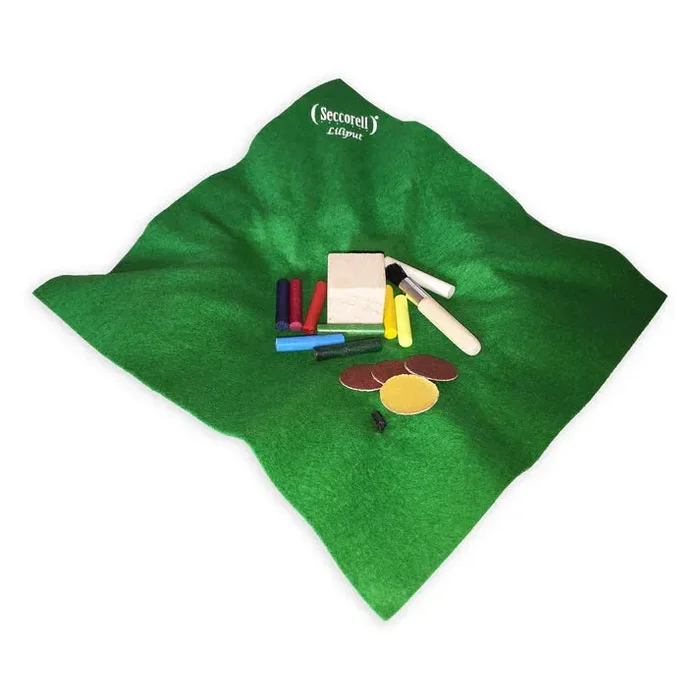8 kleine Farbstäbchen (Grundfarben), Reibering, Reinigungsbürstchen (Naturborsten), Radierstäbchen.