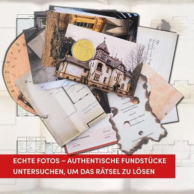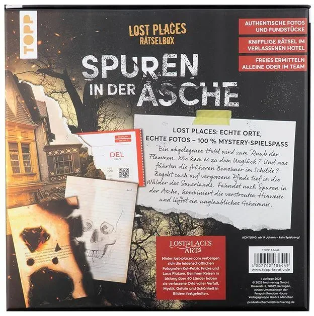 Lost Places Rätselspiel: Entdecke echte verlassene Orte mit Fotos und Hinweisen!Ein verlassenes Hotel wird Opfer eines verheerenden Brandes. Wie konnte es zu diesem Unglück kommen, und welche Geheimnisse verbargen die früheren Bewohner? Tauche ein in die Welt der Lost Places und begib dich auf eine spannende Rätselreise durch die dunklen Wälder des Sauerlands. Entdecke Spuren in der Asche, kombiniere die verstreuten Hinweise und enthülle ein unglaubliches Geheimnis.Das erwartet dich:Mystery-Rätsel: Entschlüssle die Geheimnisse des verlassenen Ortes und löse packende Rätsel.Echte Fotos: Untersuche authentische Lost Places-Fotos und authentisches Spielmaterial, um alle Fragen zu beantworten.Offenes Spielerlebnis: Arbeite gemeinsam in einer Gruppe parallel an verschiedenen Rätseln und finde versteckte Hinweise.Inhalt:14 echte Lost Places-Fotos10 authentische Fundstücke2 Umschläge mit Hinweisen und LösungenSpielprinzip:Die fiktive Mystery-Geschichte rund um einen echten Lost Place muss entschlüsselt werden. Dazu werden Fotos und Fundstücke auf verborgene Hinweise untersucht, Indizien logisch kombiniert und Codes geknackt. Nur wer alle offenen Fragen richtig beantwortet, kann das spannende Rätsel lösen!1–4 Personen | ab 14 Jahren | Spieldauer: 45–90 MinutenAngaben zum HerstellerEAN: 4007742186449