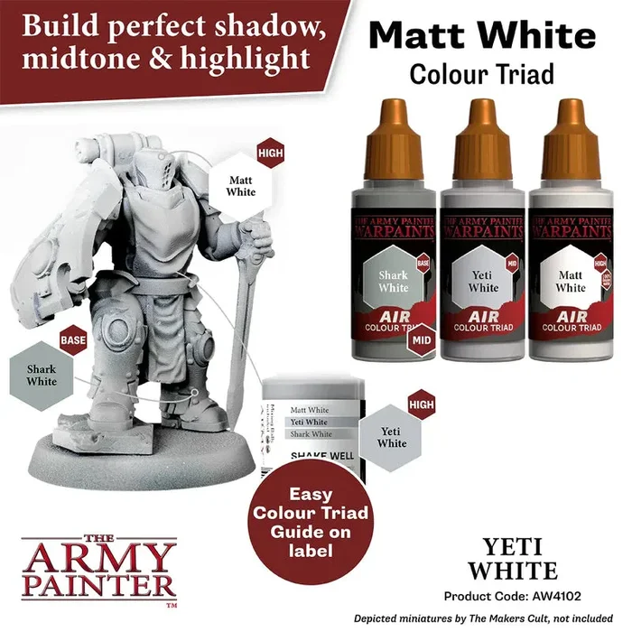 Alle Warpaints Air Farben sind bereits fertig gemischt und direkt aus der Flasche für die Airbrush einsatzbereit. Sie bestehen aus ultragefilterten, dynamischen Pigmenten. Die Warpaints Air-Reihe wurde mit einem einzigartigen und innovativen Triad-System entwickelt – jede Warpaints Acrylics-Farbe hat eine entsprechende Basis- und Highlight-Farbe. Dies macht das Hervorheben und zenithale Schattieren kinderleicht und ermöglicht ein schnelleres und einheitlicheres Bemalen von Armeen. Um die Handhabung zu erleichtern, sind die Warpaints Air-Flaschen mit zwei Stahl-Mischkugeln vorgefüllt.