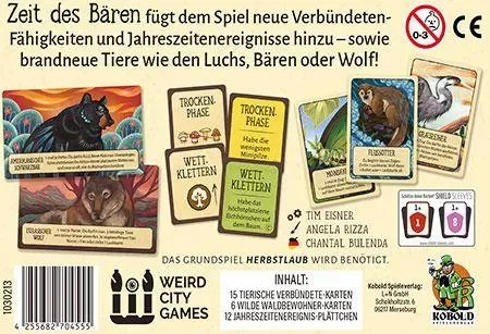 In der ersten Erweiterung für Herbstlaub streifen hungrige Tiere durch den Wald, die den Spielern einzigartige Fähigkeiten verleihen.Wenn der Sommer in den Herbst übergeht, beginnen die großen Tiere mit der Futtersuche, um sich auf den langen Winter vorzubereiten. Jeder Wechsel der Jahreszeit bringt neue Herausforderungen und Belohnungen mit sich, und alle Tiere des Waldes haben etwas beizutragen.Die Erweiterung Zeit des Bären bietet drei erweiterte Spielmodi, die dem Spiel Herbstlaub hinzugefügt werden können. Tierische Verbündete geben jedem Spieler eine einzigartige Fähigkeit, die er während des Spiels einsetzen kann. Saisonereignisse fügen jedem Frost zusätzliche Wertungsbedingungen hinzu. Die Großen Tiere betreffen den gesamten Wald und geben jedem Spieler einen Effekt, den er einmal pro Spiel nutzen kann.ACHTUNG: Zum Spielen wird das Grundspiel benötigt!