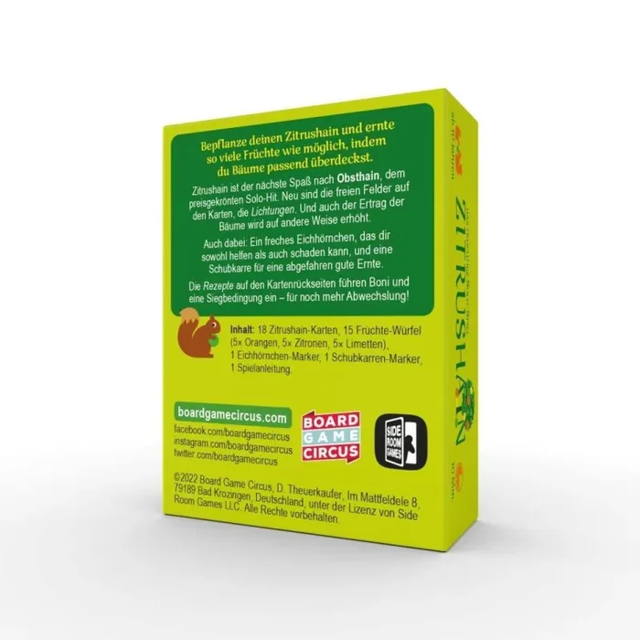 Zitrushain ist der nächste Spaß nach Obsthain, dem preisgekrönten Solo-Hit. In diesem flotten Solo-Lege-Puzzle willst du durch kluges Anlegen deiner Handkarten möglichst viele Früchte ernten. Platziere deine Karten dafür so, dass die darauf abgebildeten Obstbäume andere Bäume gleicher Sorte in deinem Zitrushain überdecken. Je geschickter du die Bäume überdeckst, desto mehr Früchte – und somit Punkte – wirst du ernten.